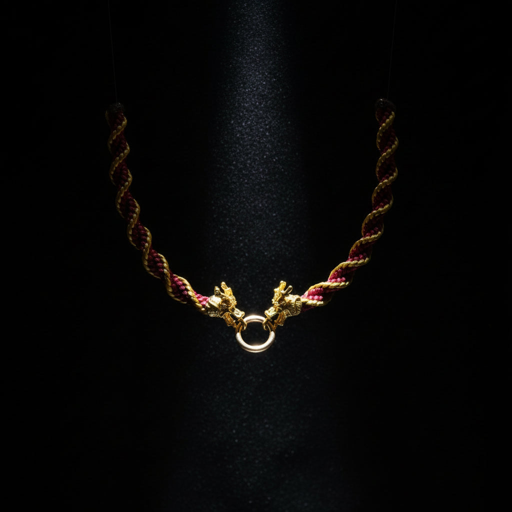A sculptural composition of hand-braided cord and twin dragon clasps — anchored by a polished ring at its centre.