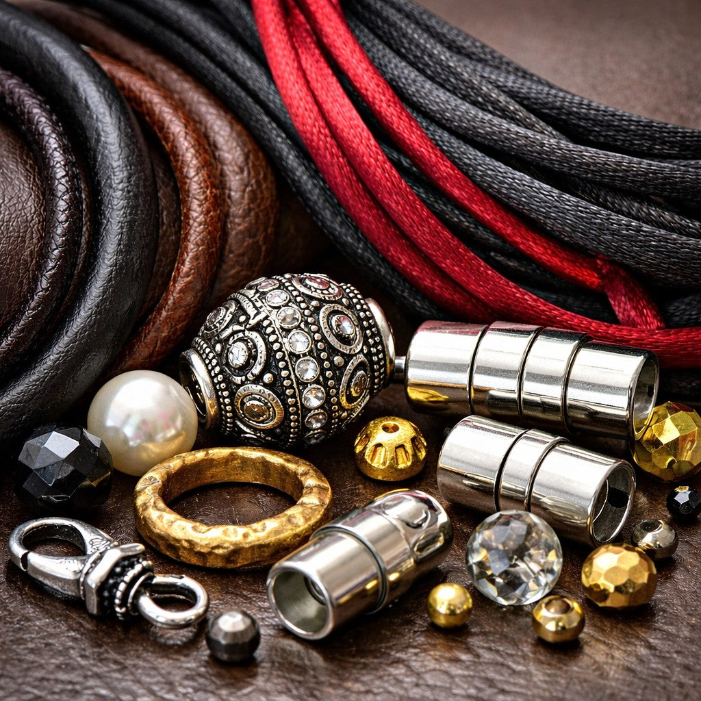 Leather is braided for durability and structure. Metals are selected for strength and finish. Textiles and threads are introduced where form calls for softness and contrast.